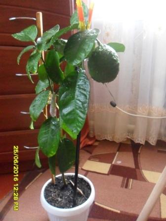Первым "культурным" цитрусом стал лимончик Пондероза, куплен был укореняшкой осенью 2014 года. Зимой поставила на него воздушную отводку, рос раскарякой, а он взял и плод завязал. Теперь бедняга старается выносить лимончик