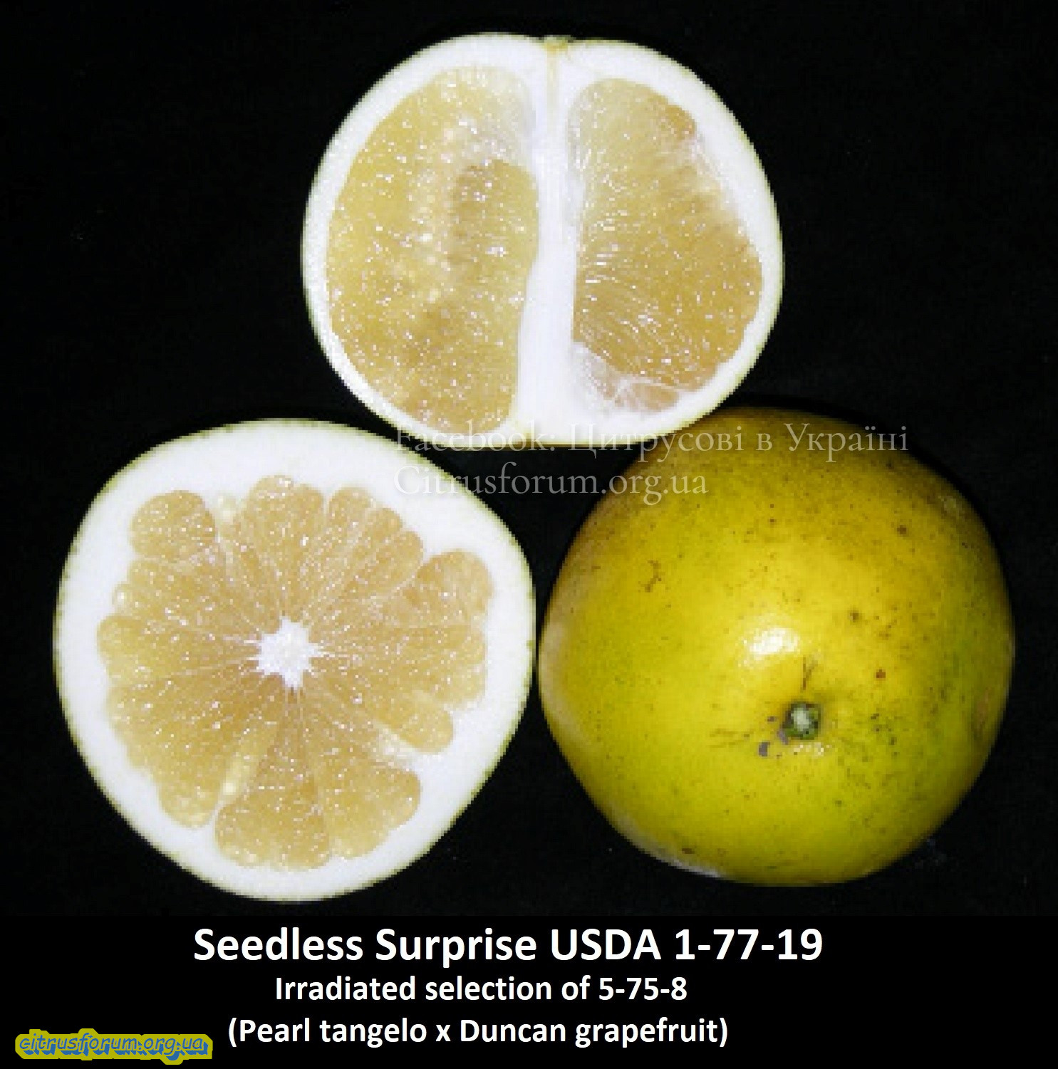 US Seedless Surprise (Безнасінний Сюрприз). Ранній сорт танжело, отриманий шляхом опромінення USDA 75-8 (tangelo 'Pearl' x grapfruit 'Duncan') Джеком Херном в 1980р. Розробленим програмою розведення цитрусових USDA.