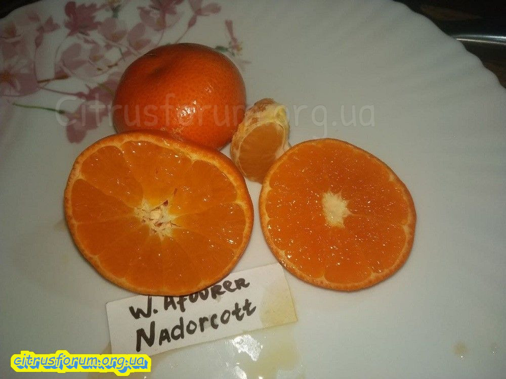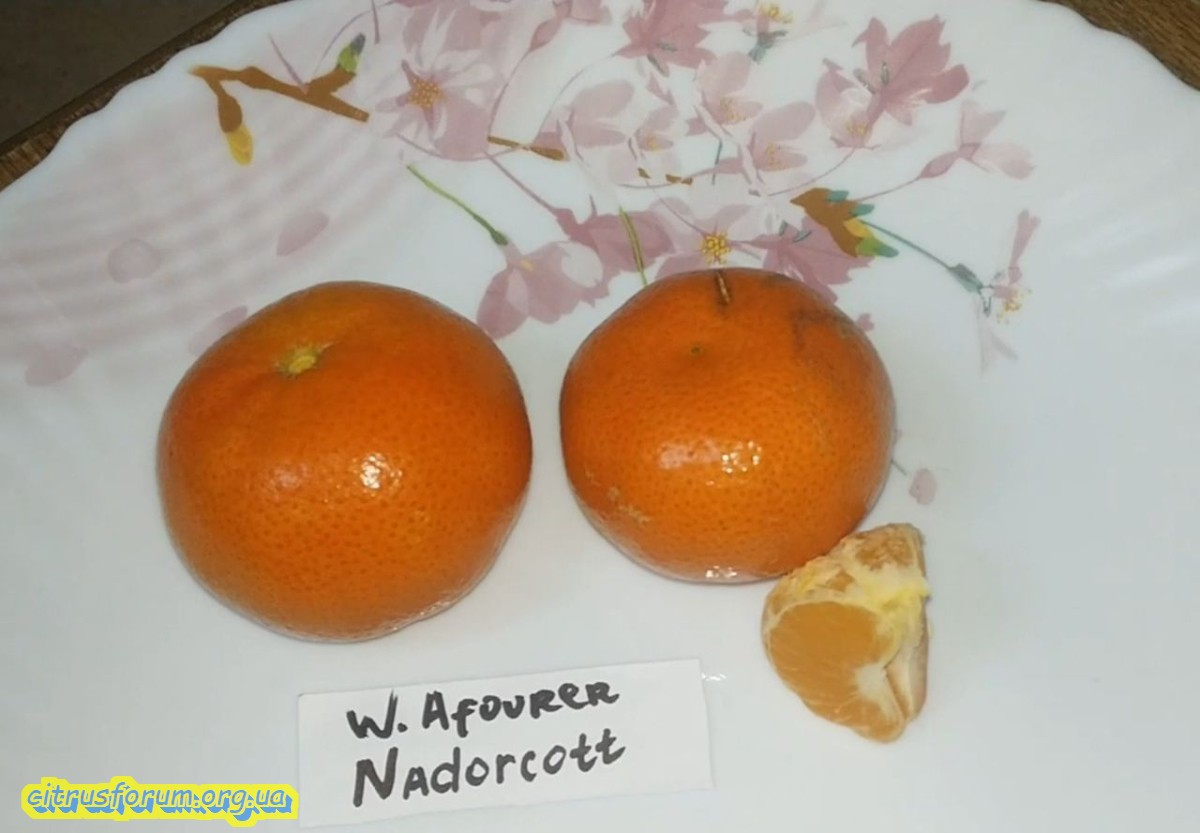 Надоркотт (син. Afourer, У. Муркотт; Рис. 5.4A; Nadori, 2004), предполагаемый спонтанный гибрид Murcott×Mandalina (Mandalina, возможно, является синонимом Ponkan в некоторых странах Ближнего Востока, где он был выведен), был разработан INRA (Национальный институт агрономических исследований), Марокко. Деревья сильные с вертикальным ростом привычка, менее плотная, чем у клементина, побеги, как правило, не колючие. Пыльца Надоркотта обладает высокой фертильностью и является сильным опылителем; кроме того, его яйцеклетки фертильны и очень чувствительны к перекрестному опылению. Надоркотт очень скороспел и продуктивен, но склонен к попеременному вынашиванию. Плоды среднего размера с глубоким красновато-оранжевым цветом кожуры и розоватым альбедо, очень гладкой текстурой кожуры, уплощенной формой и небольшим ребристым на конце стебля. Срок сбора - с начала до середины января, когда внутренние качество отличное, хотя в субтропических регионах он может созревать раньше. Очень высокое содержание сахара (10-14° по шкале Брикса) и умеренная кислотность (1,0%-1,4%) обеспечивают хорошо сбалансированное соотношение и богатый вкус, а фрукты можно собирать в течение 6 недель без потери качества. Tango и Nadorcott LS являются индуцированными мутациями Nadorcott, разработанными Калифорнийским университетом и Советом по сельскохозяйственным исследованиям Южной Африки соответственно.