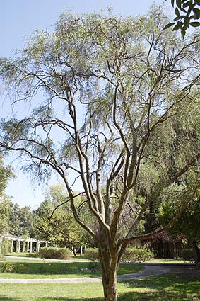 Дерево бывает без листьев, с тонкими ветками, напоминающими выгоревшее дерево.