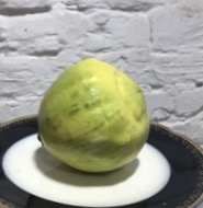 Плод данного сорта вырастила впервые, долго этот цитрон не зацветал у меня. Радовал только очень красивой желтой вариегатностью. Терпение было вознаграждено довольно крупной полосатой бомбочкой интересной формы. В интернете к сорту citrus medica variegata картинки прикладывались с изображением плодов именно такой конфигурации - широкий "ромб" с крупным расплющенным носом.