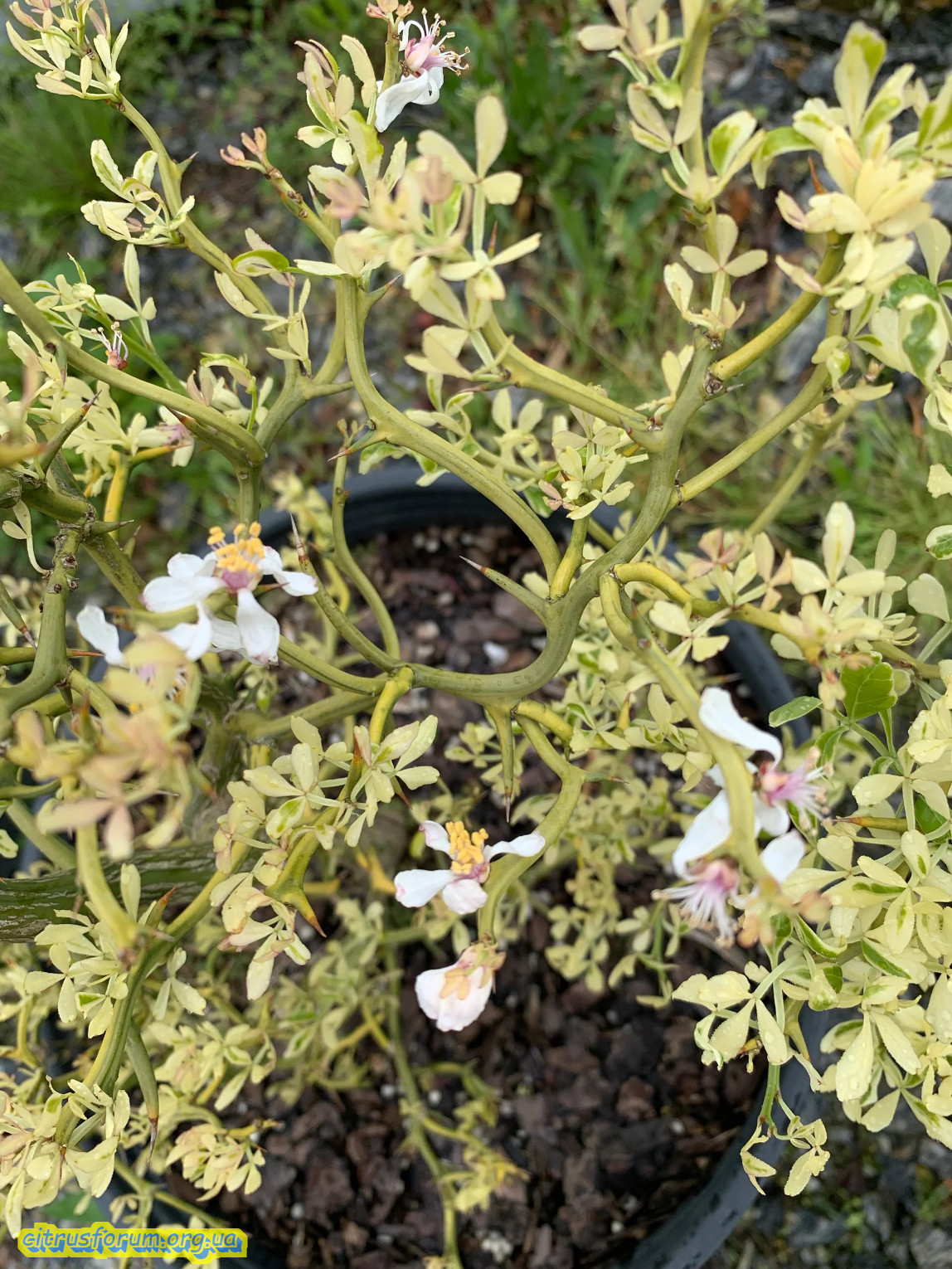 Це досить унікально тим, що новий приріст виходить повністю білим, як стебла, так і листя. Потім, коли деревина починає тверднути, стебла поступово зеленіють. Його листя може бути абсолютно білим або мати зелену середину з широким білим краєм. Нещодавно деякі з наших старих рослин зацвіли та плодоносили, але плоди були досить дрібними. Більшість цитрусових виростає з насіння, тому буде цікаво побачити, чи перенесеться різноманітність у його розсаду. Ми залишили його на вулиці в контейнері всю зиму без захисту, і не було жодних пошкоджень аж до підліткового віку. Оскільки це щеплені рослини, потрібно стежити за всіма зеленими нащадками, які будуть виходити з підщепи. Просто видаліть їх за допомогою секатора якомога ближче до стовбура. У міру дорослішання рослини проростання підщепи припиняється. Якщо говорити про його морозостійкість, то у нас був клієнт із Коннектикуту, який успішно вирощував його на вулиці в землі.