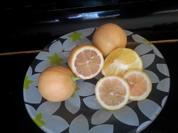 Плоды размером с куриное яйцо, как обычный лимон и аромат и вкус, лимонный :-) но с розовой мякотью, и в полной зрелости, кожура тоже с розовинкой.