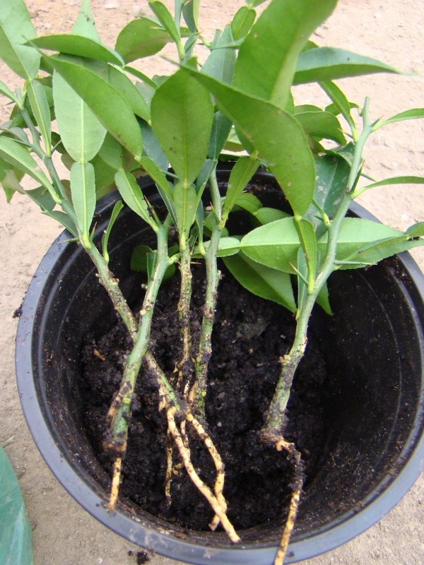 Юзу меня поразил своей укореняемостью. Делая прошлой осенью прививки, обрезанные верхушки самых толстеньких юзу выбросить было жалко и я их просто воткнул в землю в горшок и накрыл сверху пакетом. Так они простояли всю зиму в самом темном и холодном углу теплицы. Думаю в отдельные дни там доходило до 1 градуса, а в общем не превышало +5. Не заглядывал к ним вообще, а сегодня решил открыть пакет и посмотреть. Как же я удивился, когда попытавшись вытащить черенок из земли понял, что он укоренился. Без подогрева, стимуляторов и других танцев с бубном - 100% укореняемость.