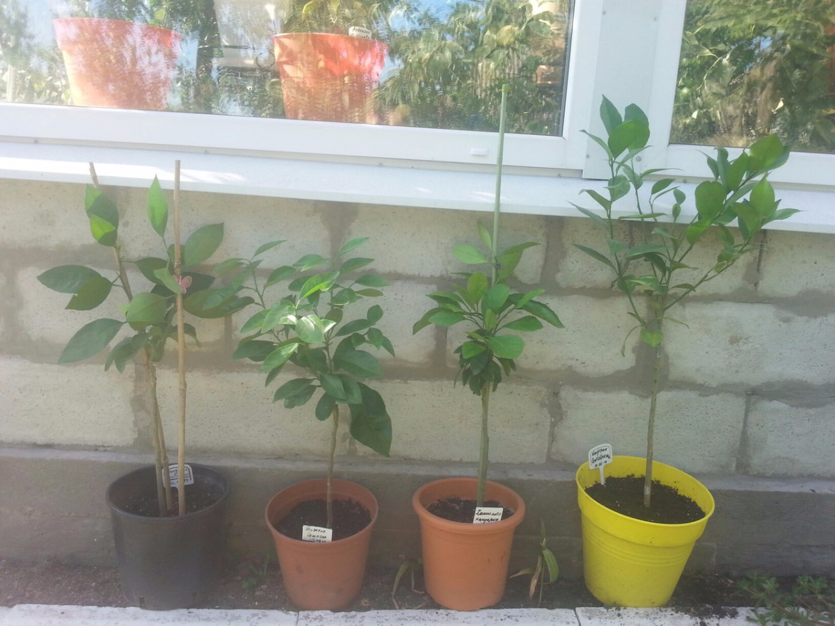Вот обещанные фото,В чёрном горшке мандарин Ковано- Васе, танжело Томпсон, мандарин Хашимот, ( прививались в сентябре 2014) и мандарин Сентябрьский, май 2014. Хашимото и Сентябрьский подстрижены, причины у каждого свои.