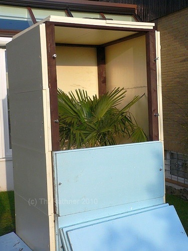 Началась подготовка к укрытию пальм. Пока только собираются короба, а крышка (или боковина) не закрываются, т.к. морозов ещё не было и в ближайшие десяток дней не предвидеться, но надо быть готовым. Пальмы связуются снопом и оборачиваются в пару слоёв агроволокном. Укрывать полностью собираюсь где-то в начале декабря, когда температура опустится ниже -5С.