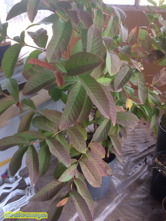 Подскажите почему на гуаве покраснели листья ,это ей холодно ?
