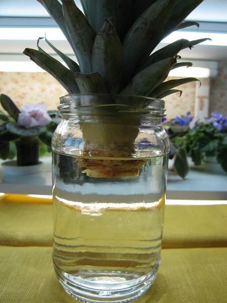 Для получения корней используйте самый простой и, как показывает практика, самый эффективный способ: поместите подсушенную корону в стакан с водой, так чтобы вода покрыла обнаженный ствол. Стакан с ананасом поместите на подоконнике рядом с Вашими комнатными растениями. Следите за уровнем воды и периодически заменяйте воду полностью, по прошествию примерно трех недель ананас должен пустить корни. Когда корешки достигнут пары сантиметров в длину, тогда ананас можно высаживать в землю.