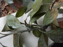 Уншиу Сильверхилл на трефе - минимум повреждений, листья без изменений, но есть морозобоины коры на тонких ветках