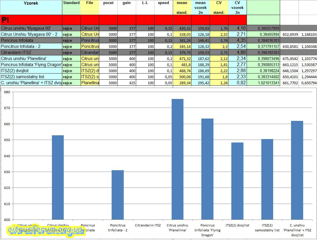Средние для понцирусов 645 пм, для уншиу 660, Прага 650. Эти значения в данном случае статистически одинаковы, т.е. метод не позволяет отличить геномы понцируса и сатсумы , их гибрида и химеры.