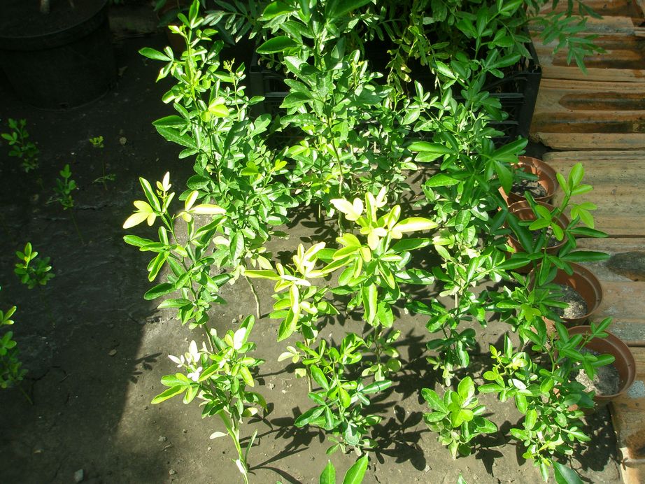 Нижний ряд - укоренённые верхушки от прошлогодних прививок: внизу слева хлороз цитрумело свингл. Следующий ряд цитрумело свингл из семян - тоже с хлорозом. Ещё ряд по горизонтали цитрумело из Львова - рослый с зелёными листьями. Предпоследний ряд - 5-а хорошее ветвление и самый приспособленный к моей почве и верхний ряд - цитранж тройер - то же самое можно сказать.