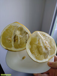 Висіяв насіння жовтого Помело (Honey Pomelo), привезеного із Китаю. Смак приємний. Виріс трилистий листок, сіянець із 15шт. Видимо запилений з Poncirus Trifoliata. Буду наглядати дальше...