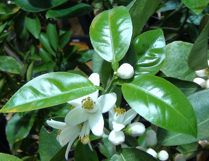 Цветки 4-5-лепстковые, среднего размера (3,8-4,0 см в диаметре), одиночные, реже собраны по 2-3 в небольшие соцветия. Лепестки по форме широко-ланцетные, на внешней стороне хорошо заметны крупные зеленоватые эфиромасличные железки. Чашечка с 4-5 светло-зелеными чашелистиками. Тычинок 24, сросшихся группами. Пестик с округлым светло-охристым рыльцем, по высоте несколько выше или на уровне тычинок. Завязь обратнояйцевидная, зеленого цвета; гнезд 10-11.