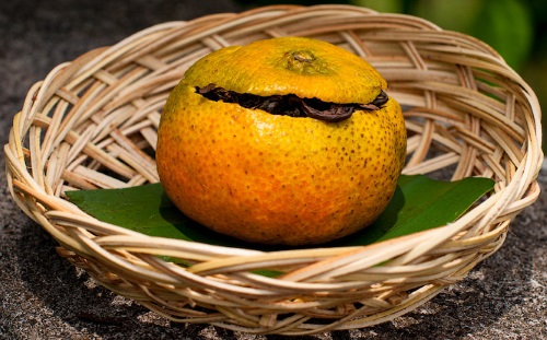 "" Нужно срезать верхнюю часть мандарина, вытащить мякоть, и вместо нее засыпать листовой чай, плотно утрамбовав, и прикрыв верхней срезанной частью кожуры, после чего оставить на солнце на 4 дня. Чай пропитается мандариновым ароматом от его цедры, и будет готов к завариванию."