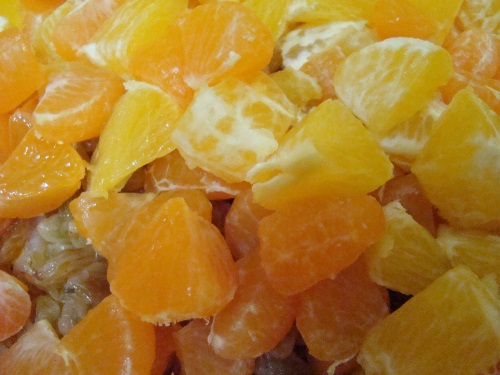 В предверии Нового года расскажу о нашем любимом семейном салате, который мы чаще всего готовим как раз на этот праздник. Салат фруктовый, а одними из основных ингредиентов являются апельсин и мандарин. Итак, барем два апельсина, четыре - пять мандаринов, два банана, два яблока, крупную грушу(можно и без нее) и банку консервированных ананасов. Все это чистим, режем на крупные куски (примерно так), посыпаем кокосовой стружкой и заливаем густым йогуртом. Перемешиваем и едим. Готовить салат лучше незадолго до застолья, что бы не успело выделиться много сока из фруктов. Когда уже все наелись от пуза и напились естественно тоже - этот салат просто находка. На него всегда есть место, во-первых и пищеварение налаживается, во вторых. Всякие пары разные