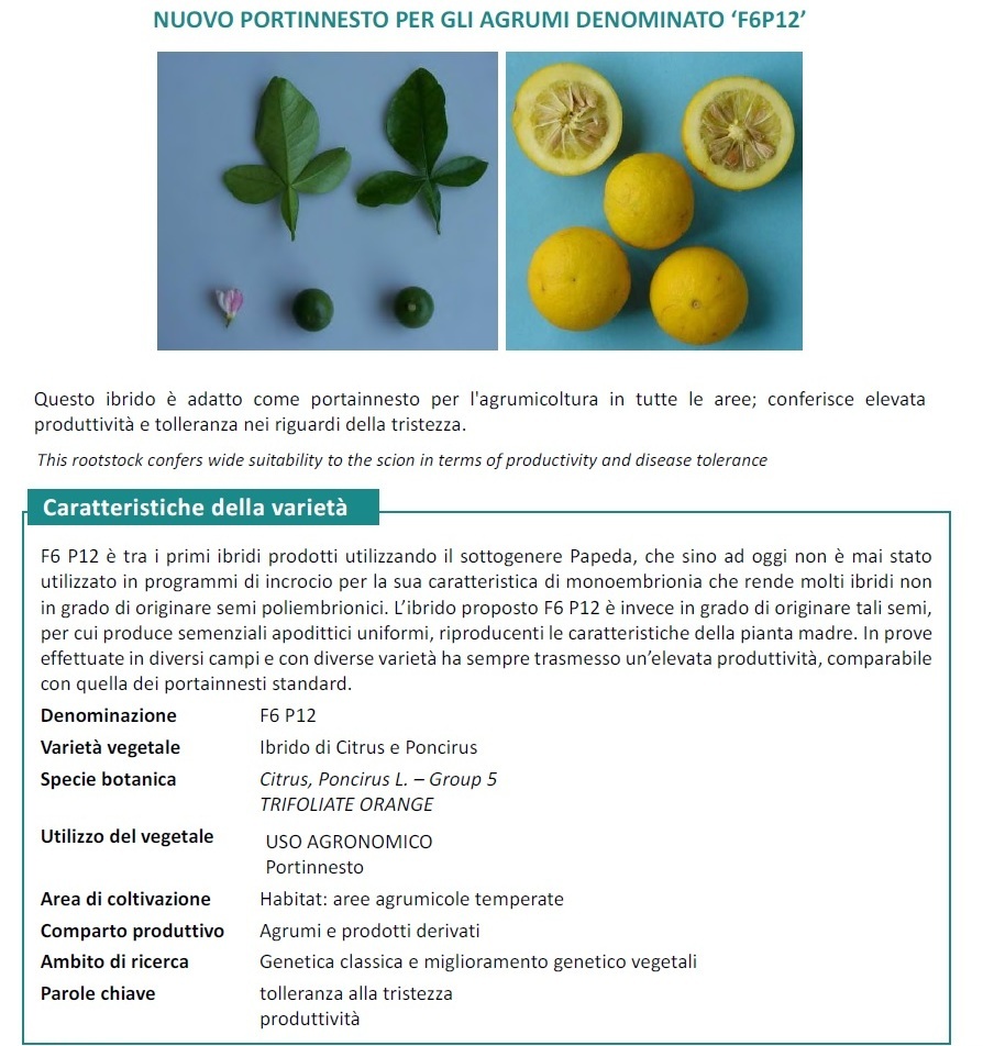 F6 P12 один из первых подвоев, выведенных с использованием гибридного подрода Папеда, который до сих пор никогда не было ипользован в селекционных программах из-за его моноэмбриональности, что делает многие гибриды не способными производить полиэмбрионные семена.