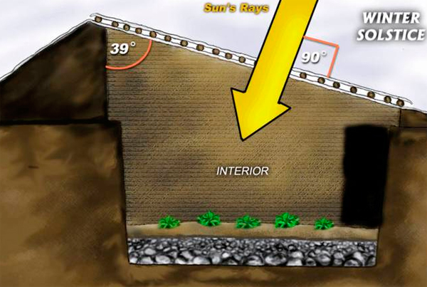 По рисунку видно, что важное значение имеет угол наклона крыши. Его в каждом случае нужно высчитывать индивидуально в зависимости от географической широты местности. А вообще траншейка - это же энергосберегающая технология. Весь мир от этого на ушах. Так что мы, как говорится, в тренде.