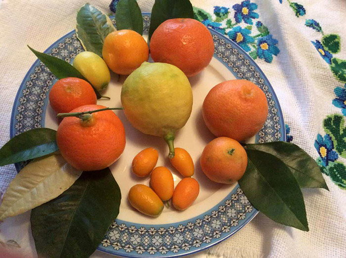 Это часть урожая ДО начала дегустации. В центре красавец грейпфрут, сорт неизвестный, но оооочень вкусный! Рядом с грейпом мандаринки Скороспелый и Хоникан,неизвестный клементин (предположительно Каффин), ниже на секции - два апельсина: Парсон Браун и Вашингтон Невел,а так же лимончики Волкамериана вариегатная и сицилийский. А напротив грейпа - самый крупный мандарин Миягава,ярко оранжевый танжело Векива, кукле ,кумкват Обовата и лимончик сицилийский.А в центре блюда -вариегатная Маргарита.