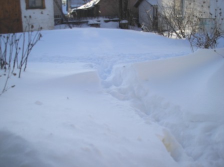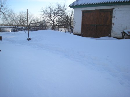 В огороде его как раз поменьше, переживаю за виноград в связи с предстоящими морозами. а вот во дворе из-за построек сугробы намело. И как на зло на въезде.