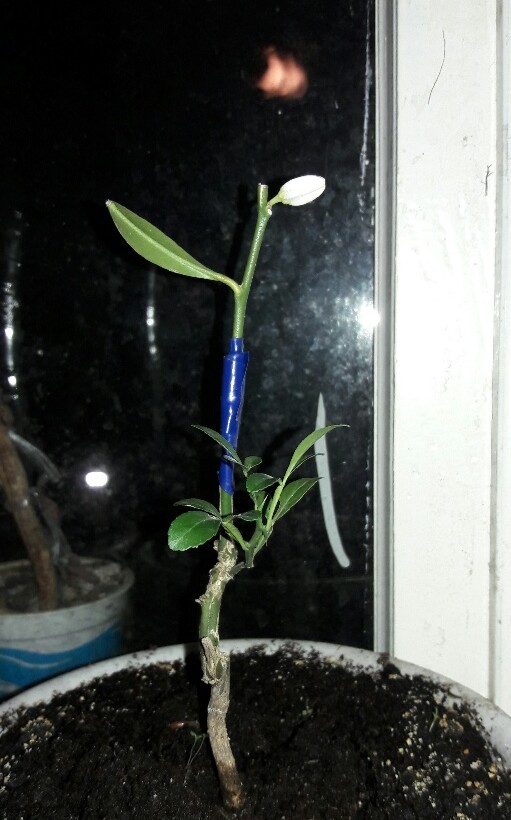 Далее не совсем по погоде, но всё же. Получилась прививка черенка от растущего под Парижем Ичангквата: