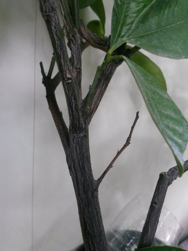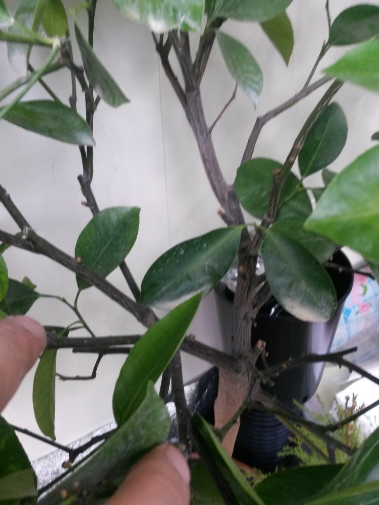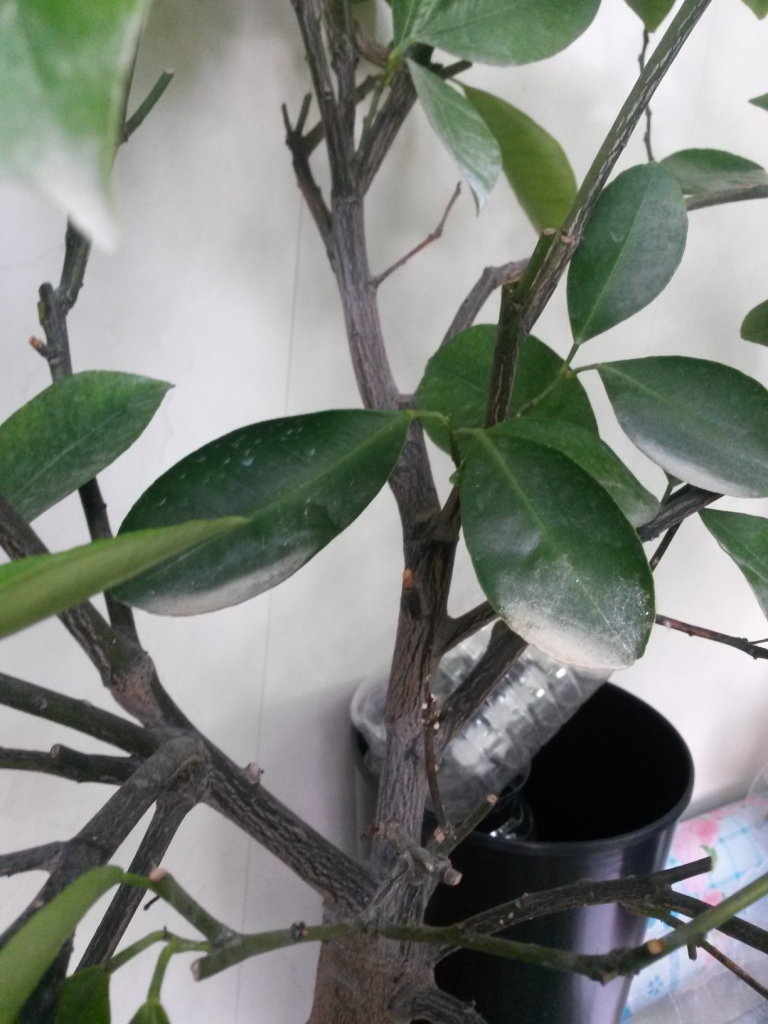 Последние недели заметно листопадит, после зимовки (январь-февраль постоянная темп. в районе 8-10 град.) очень долго отходил, выдал один прирост, и тот хлорозный, слабо цвел, завязал около 5 плодов. Сегодня заметил 7 усыхающих больших и меньших веток и заметный бледный налет именно на самих каламондиновых ветках, сам ствол вроде ничего.