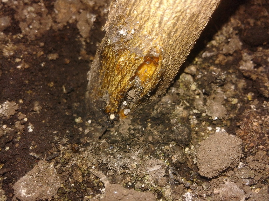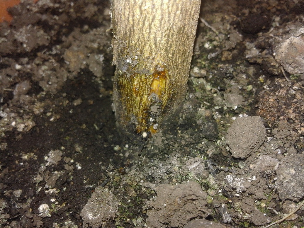 С виду растение - здоровое, но вот под биркой меня ждал неприятный сюрприз, сразу возле грунта с одной стороны разрыв коры с камедью, бирку еле оторвал от нее.