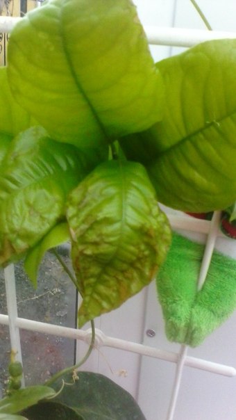 Таня, похожие пятна, я наблюдал в прошлом году на приросте одного из моих лимонов. После проведения внекорневой подкормки, обжог молодой прирост на лимоне Imperiale. Может все таки перекормила?