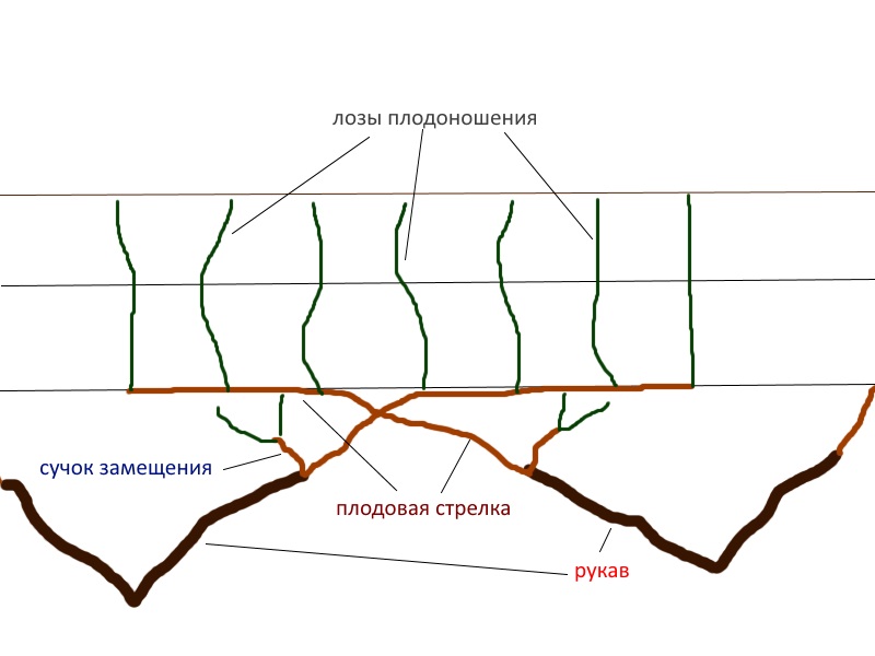 А почему только в одну сторону? На Вашем рисунке при одноплоскостной шпалере отпадает вообще необходимость во втором рукаве, потому что от нижней плодовой стрелки вертикальные побеги и так закроют всю плоскость шпалеры, куда уж там второй рукав. Будут одни листья, а ягод не дождетесь и болячки кончат, заморитесь кропити :st_op: Виноград очень не любит загущения, тени и высокой влажности.