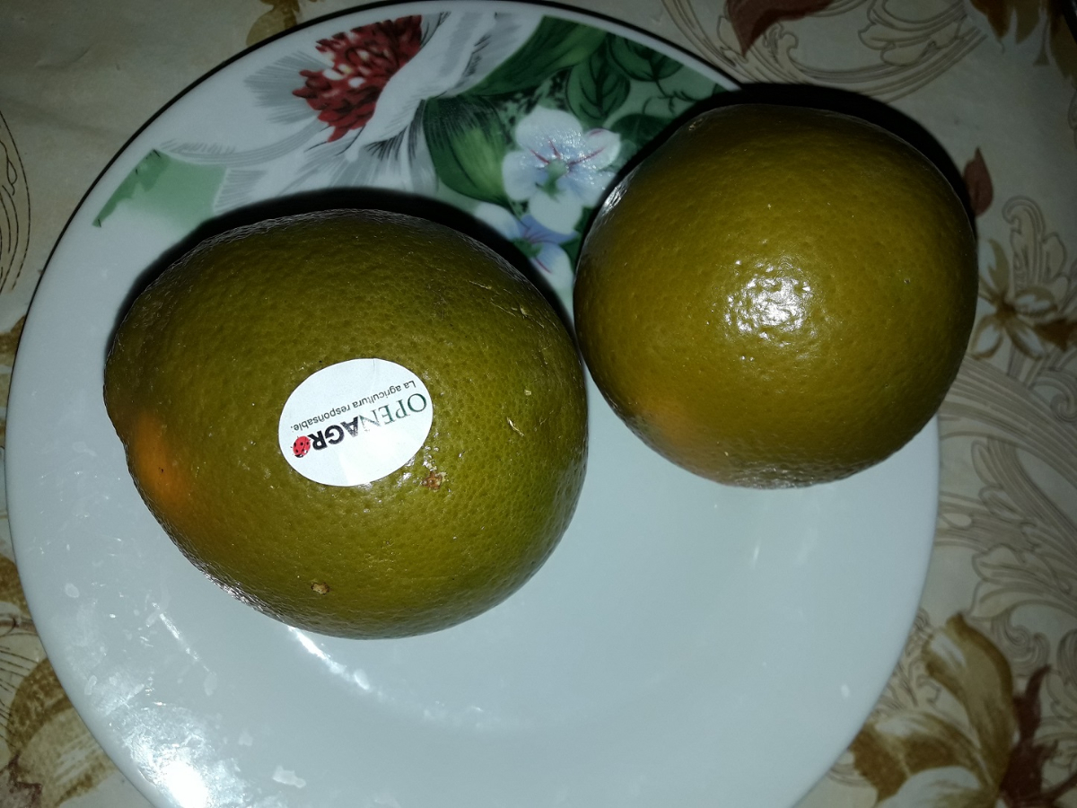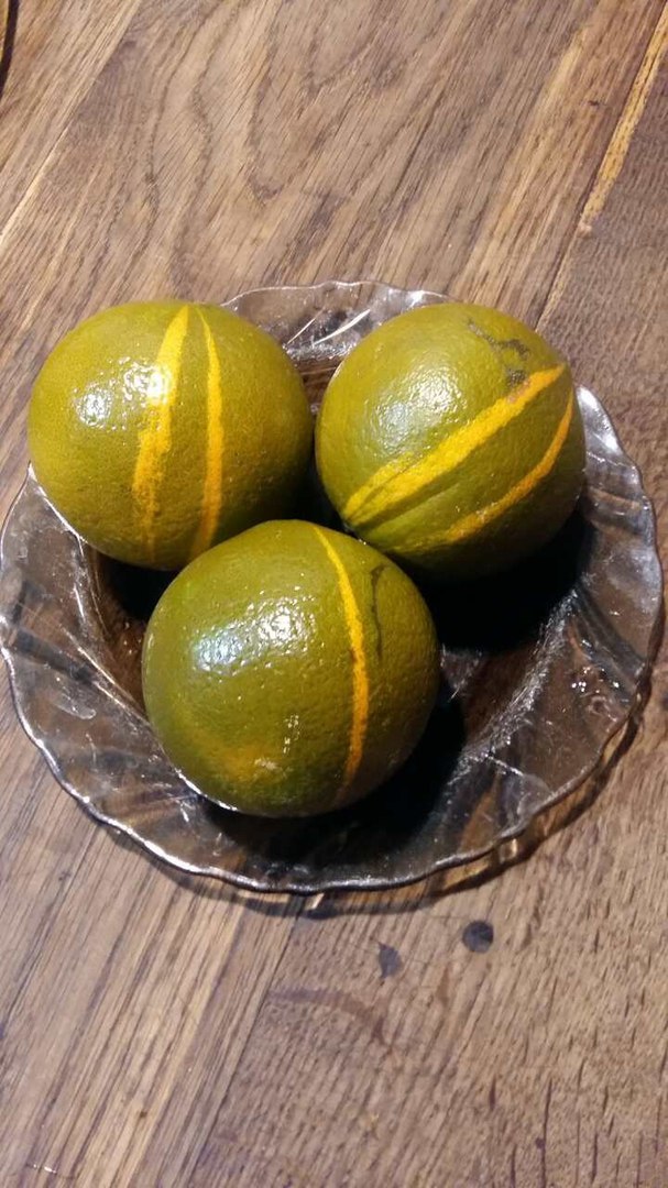 По цвету плод как будто на оранжевый апельсин нанесли сверху краску цвета темный хаки.