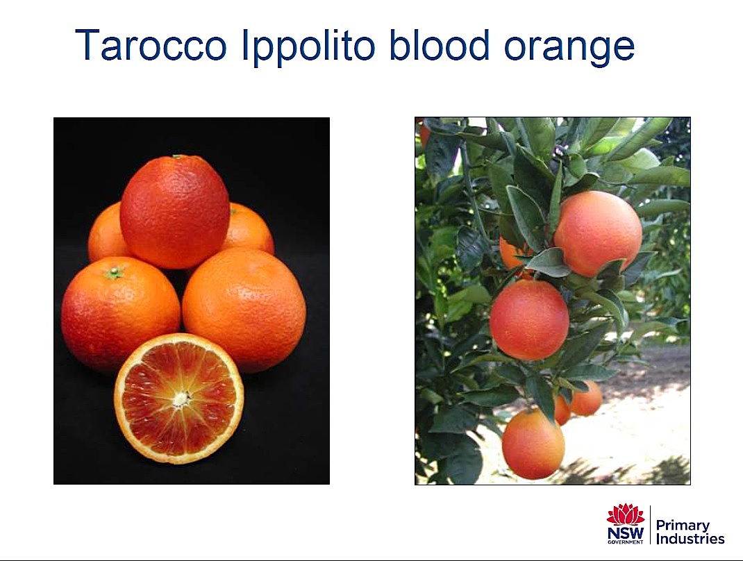 Разновидность, полученная в 1998 году. Этот сорт начинает созревать в конце января и сбор урожая длится на протяжении февраля и марта. Вес плодов до 200 г, форма: овальная, кожура при созревании приобретает темно-красный цвет. Мякоть характеризуется высокой пигментации, с хорошим выходом сока и отсутствием семян. TAROCCO IPPOLITO, является одним из сортов, чьи плоды имеют самые высокие уровни антоцианов, а также гармоничный контраст между сахарами и кислотами.