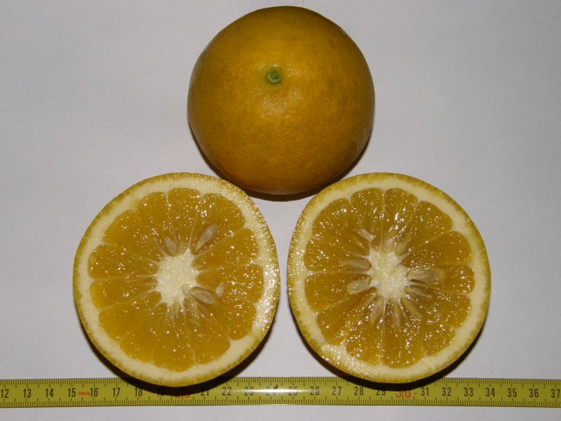 Дерево до 5 м высотой, с округлой, редкой, густооблиственной кроной (рис. 26). Листья крупные, плотные, 10,0-17,5 х 6,7-8,9 см, мандаринового типа. Цветки среднего размера, 34-38 мм в диаметре. Плоды округло-плоские, крупные, 7,1-8,5 х 9,1-12,0 см, массой 335,8-620,5 г; кожура тонкая, до 5 мм толщиной, с очень гладкой, блестящей поверхностью, золотисто-желтого цвета; мякоть желтая, обильно сочная, пленки нежные; семена отсутствуют или их очень мало. Высококачественный гибрид, сочетающий признаки обоих партнеров, во всех отношениях превосходит все интродуцированные сорта помпельмуса в условиях влажных субтропиков Кавказа.