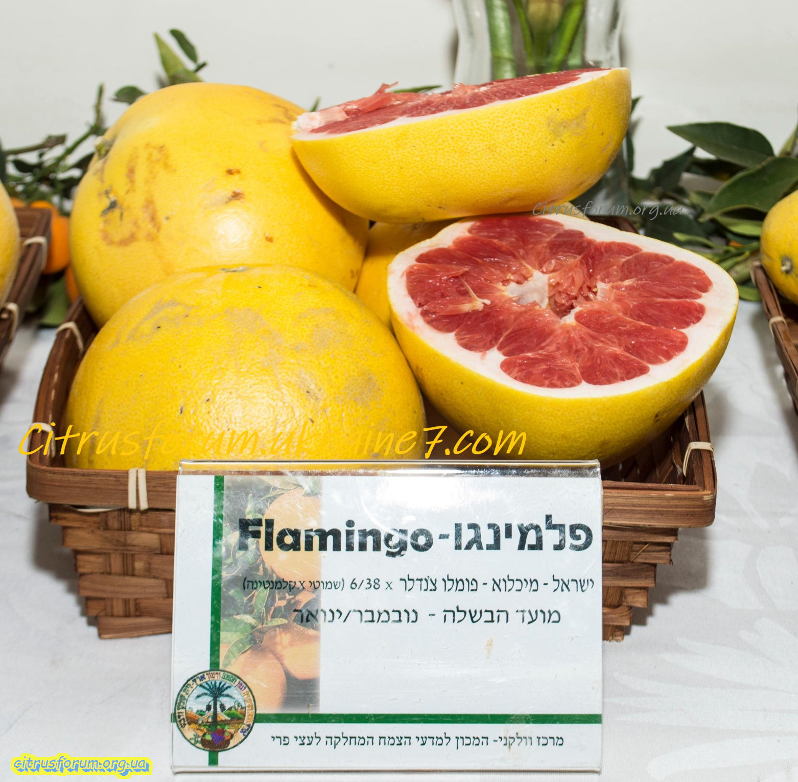 Фламинго: раннеспелый (октябрь-декабрь) сложный гибрид с участием помело Чендлер, апельсина Шамути и клементина. Содержание сахара 15%, интенсивная красная окраска обусловлена присутствием каротиноида ликопина и не зависит от условий созревания.