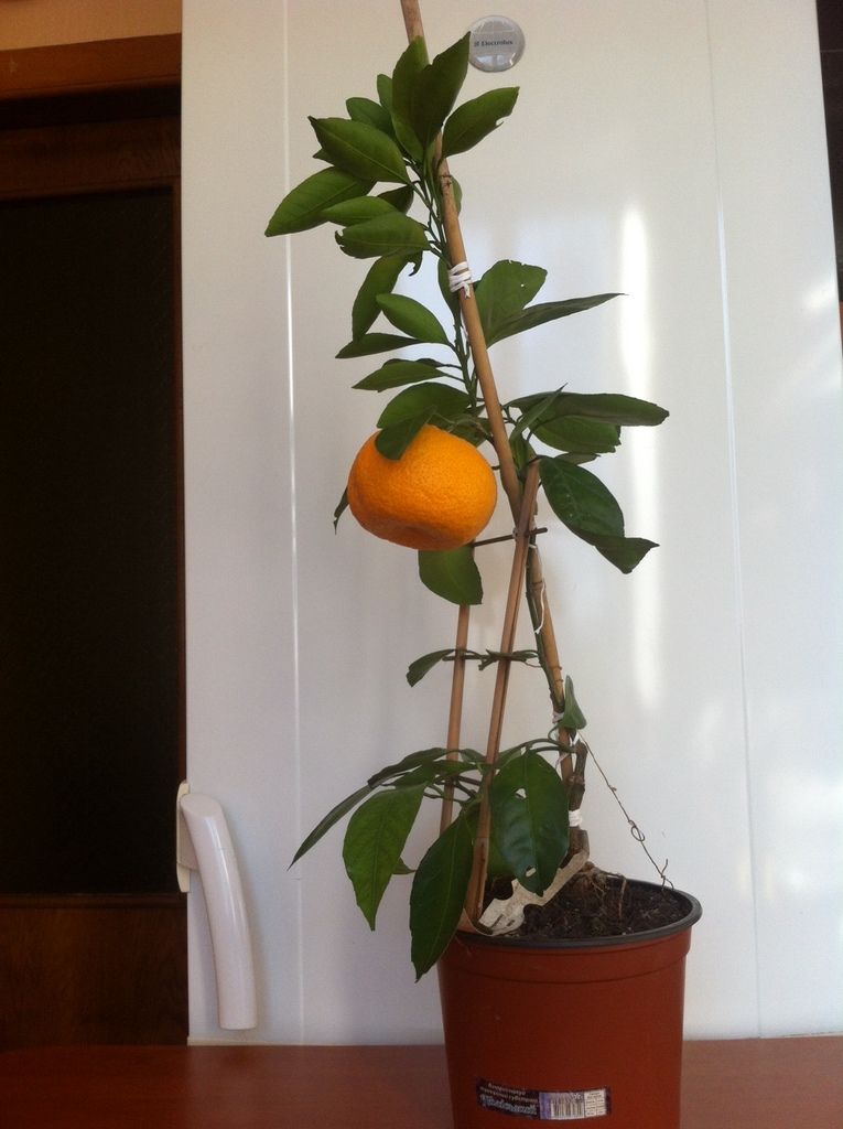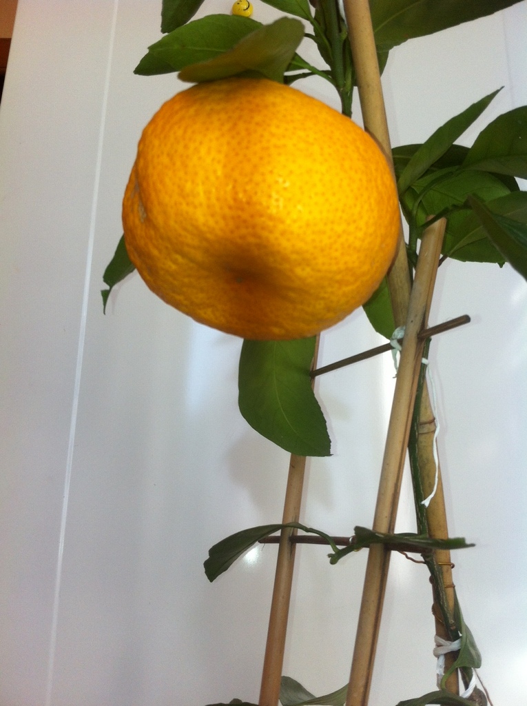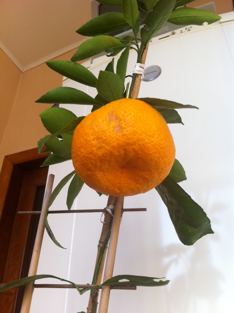 Мое деревце тинторовское, очень изящное, 'ручки-ножки' маленькие и тоненькие. Плод завязался в начале лета, я его оставила(думая, мол потом удалю), так как он был один, и параллельно очень неплохо наращивалась листва. Дальнейшие наблюдения, позволии сделать вывод, что можно рискнуть оставить плод. И, надо же - деревце плод не просто выносило, а укрупнило до гигантских размеров(в диаметре он был 10,5см). Он был сорван в начале декабря. Вкус хорош! Классический, знакомый, ярковыраженный мандариновый. Однако, чувствовалось, что когда дерево окрепнет, плоды будут еще слаже.