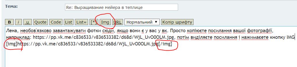 Лена, необов'язково завантажувати фотки сюди, якщо вони є у вас у вк. Просто копіюєте посилання вашої фотографії, наприклад: https://pp.vk.me/c836533/v836533382/d68 ... vO0OLM.jpg, потім виділяєте посилання і нажимаєте кнопку IMG