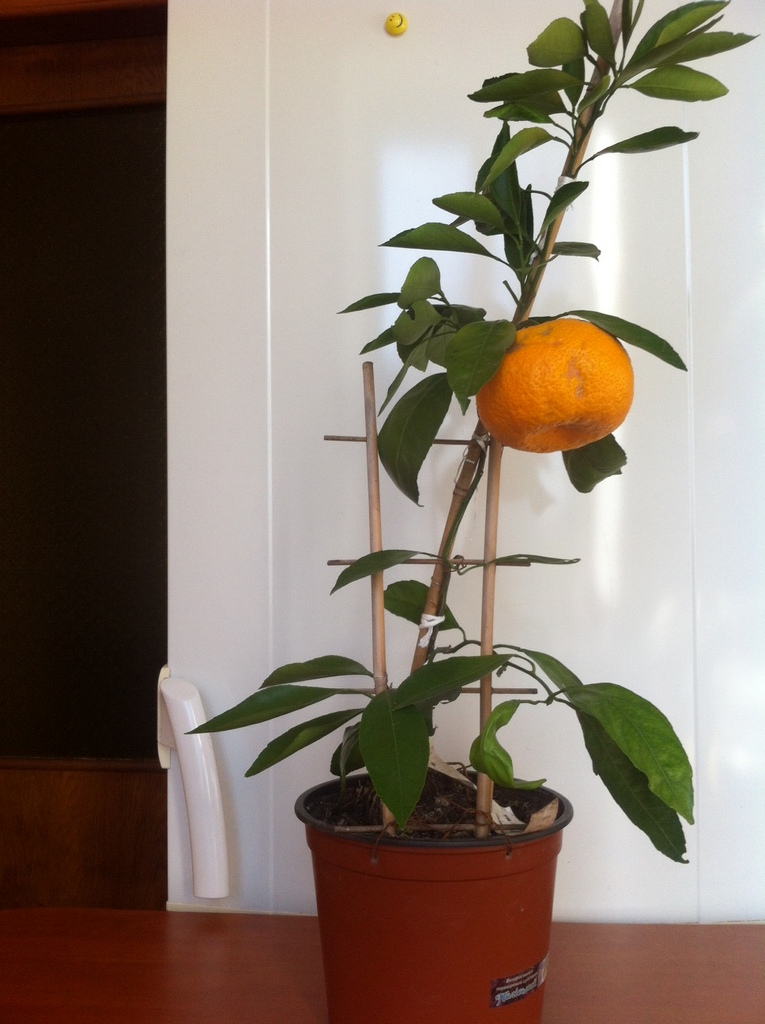 Мое деревце тинторовское, очень изящное, 'ручки-ножки' маленькие и тоненькие. Плод завязался в начале лета, я его оставила(думая, мол потом удалю), так как он был один, и параллельно очень неплохо наращивалась листва. Дальнейшие наблюдения, позволии сделать вывод, что можно рискнуть оставить плод. И, надо же - деревце плод не просто выносило, а укрупнило до гигантских размеров(в диаметре он был 10,5см). Он был сорван в начале декабря. Вкус хорош! Классический, знакомый, ярковыраженный мандариновый. Однако, чувствовалось, что когда дерево окрепнет, плоды будут еще слаже.