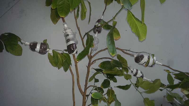 инжир - пришлось уменьшить частоту включения с 15 до 30 минут, корни валили в верхней части теплицы - хорошо