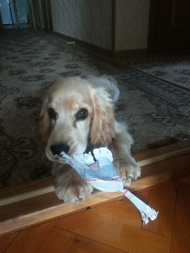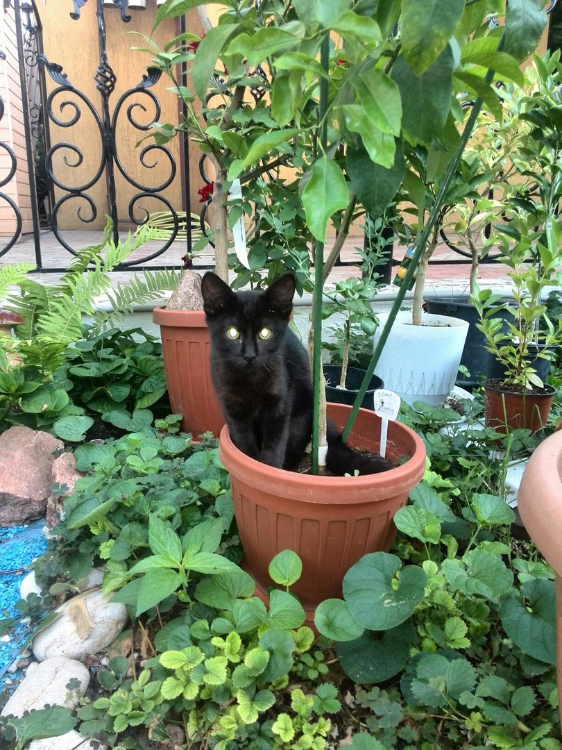 Вот так уничтожается посадочный материал цитрусовых, если не уследишь. Стащил с балкона, смотрит в глаза, знает что нельзя, а из зубов не выпускает :-):