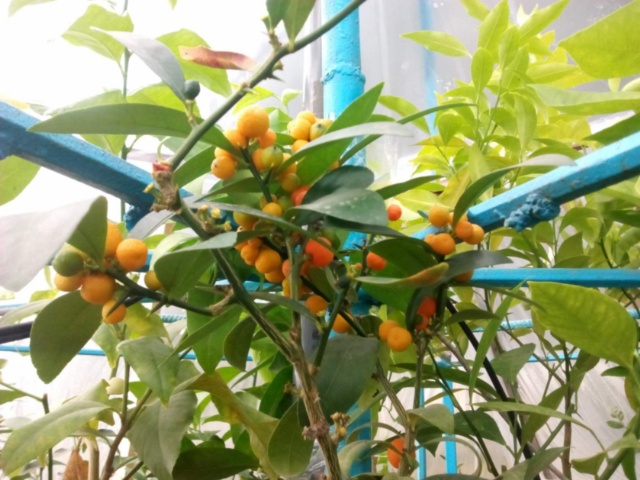 Сделала фотографию перед сбором урожая) Сейчас кумкват стоит грустный - без плодов и пока что без прироста. Ждут тепла вместе с Мейвой.