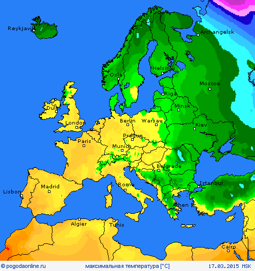 Карты погоды рисуют под Парижем на середину марта днём в районе +16: