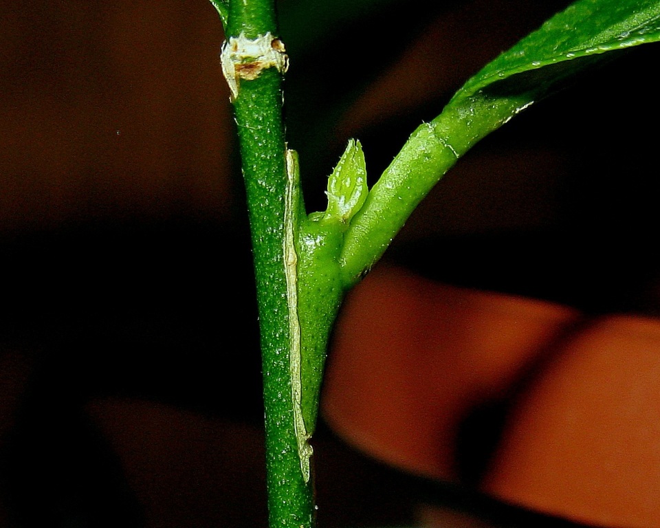 Похоже всё же раннее открытие обвязки помогает наладить более раннее дыхание. Однако есть и не приятный момент. Если почка со слегка подсохшим листиком, то это может сыграть злую шутку. Такую прививку, уже со снятой обвязкой, надо держать в парнике до прорастания почки, и только после этого приучать к сухому воздуху. Иначе этот лист от сушит саму прививку от стволика. Скорее всего от раннего приучивания накрылась прививка и прошлого лаймквата. :du_ma_et: Такая же участь ждала бы и Дженоа, если бы вовремя не заметил и вернул прививку в парник. :mi_ga_et: