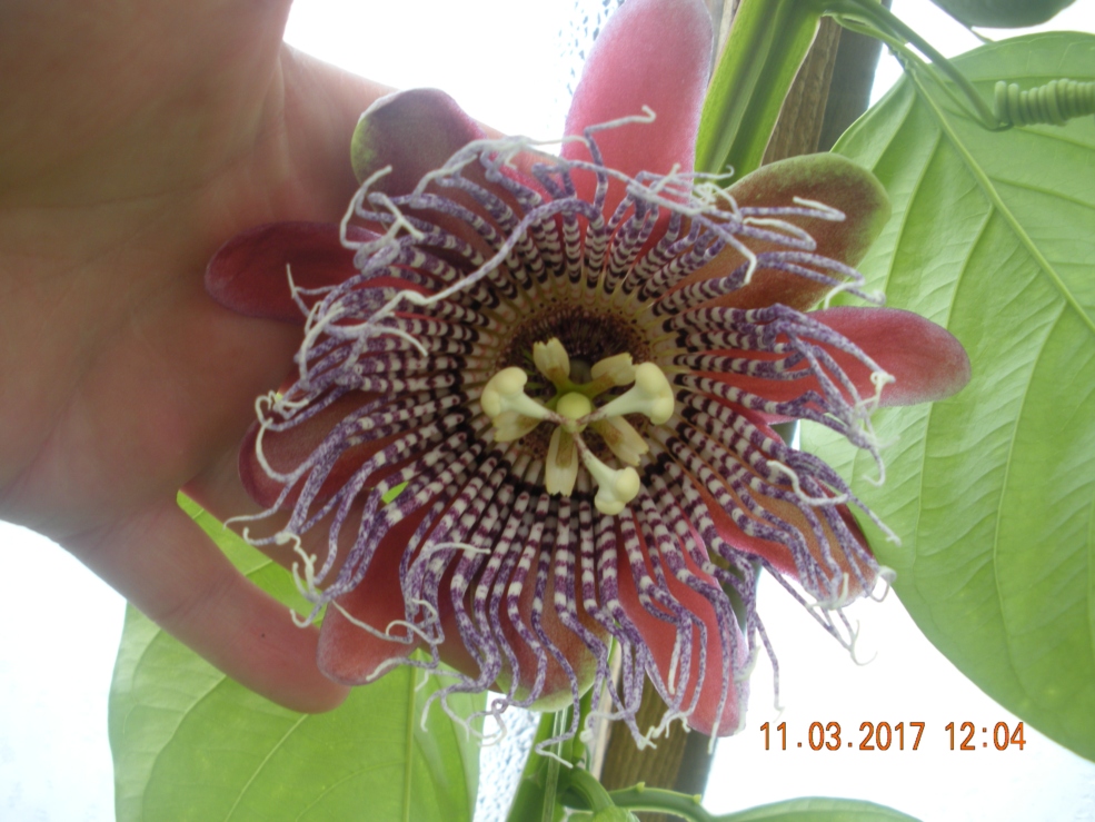 Выкладываю фото цветения пассифлоры Precioso (Прециозо). Это большая лиана с крупными, цельными листьями и и великолепными цветками. Цветение происходит при коротком дне, у меня это было в декабре и повторно в марте. Самоплодный сорт, то есть, для опыления подходит его собственная пыльца. Образует вкусные плоды, по форме и размеру похожи на небольшую дыньку. К сожалению, мне не удалось их увидеть, поскольку в моей теплице в период цветения Прециозо держится слишком высокая влажность воздуха - зимой проветривать не получается. А пыльца пассифлор очень чувствительна к влажности и становится неспособной к опылению. В условиях светлой комнаты или лоджии, при опылении вручную плоды должны завязаться .