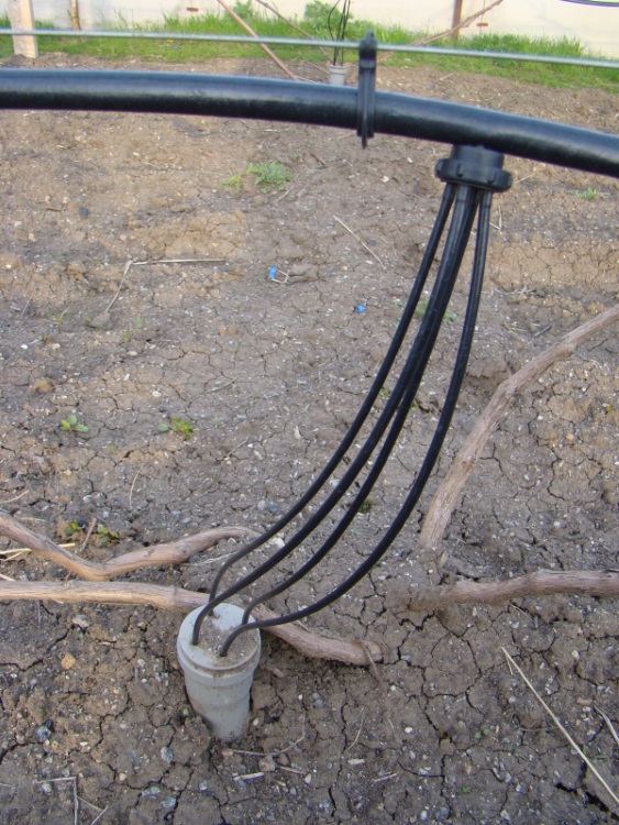 Так как у меня виноградник посажен на двух участках и в разное время, я испытываю две абсолютно разных системы полива, хотя есть у них одна общая важная особенность - вода поступает под землю. Подземный полив предпочтителен для меня из-за того, что не пересыхает и не засоливается верхний шар почвы, кроме того не нужно мульчировать, рыхлить и т.д.На первом участке еще при посадке в посадочные ямя была установлена пластиковая труба 50-ка, нижний конец которой вставлен в мешок с ведром щебня, а верхняя выступает на 10 см. над поверхностью почвы. В трубу выведено четыре микротрубочки от капельницы. Скорость подачи воды при включенной системе - 12 литров в час под куст. Эта же система используется и для ирригации. Я вношу четко нормированное количество удобрений, расчитанное по необходимому количеству элементов для каждого периода вегетации винограда, под каждый куст, делая их маточный раствор и подключая спецприспособление, впрыскивающее их в работающую систему полива. Пока в этой системе все нравится. На втором участке , в междурядье на всю длинну выкопана траншея глубиной 50 см. На дно улложена обычная пластиковая труба, в которой через 50 см 1мм сверлом просверлены дырочки. Потом это место обвязано в два слоя плотным агроволокном, что бы дырочки не забивались грунтом. Траншея засыпана до самого верха навозом. Примерно за пол часа в 55 метровой длинны траншею уходит куб воды. Эта идея мне очень понравилась, но все время гложит мысль - а все ли дырочки работают и все ли кусты получают одинаковое колличество воды. В этом недостаток способа, но навоз и вода вкупе, масса червей и очень быстрое разложение навоза, двусторонний полив каждого ряда, ведра шампиньенов с виноградника