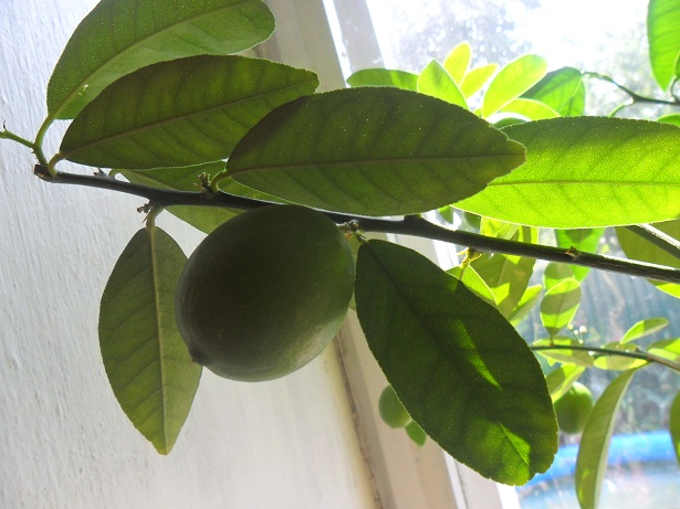 Каффир - лайм, прошлогодняя прививка на сеянец грейпфрута, забутонился в конце июня, в июле процвел, и завязал с десяток плодиков, оставила 4, а дальше пусть сам решает