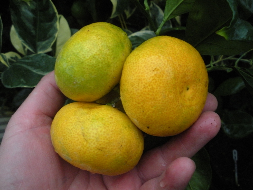 Ponkan ещё зелёный, хотя цвёл в конце февраля. Был весь усыпан цветами и осталось очень много завязи, как для его размера. Ни в какую сам не хотел сбрасывать, пришлось отрывать уже довольно крупные плодики, когда руки дошли. Оставил на нём 6 плодиков, 2 из них - на фото. Притом растёт он в небольшом горшке и стоял в довольно притенённом месте. К тому же, пересажен полтора года назад, и в этом сезоне ничем его особо не подкармливал, никаких Осмокотов, только изредка по листу вместе с остальными. Короче, поиздевался я над ним. Могу представить, что бы он выдал, если бы всё было, как положено.