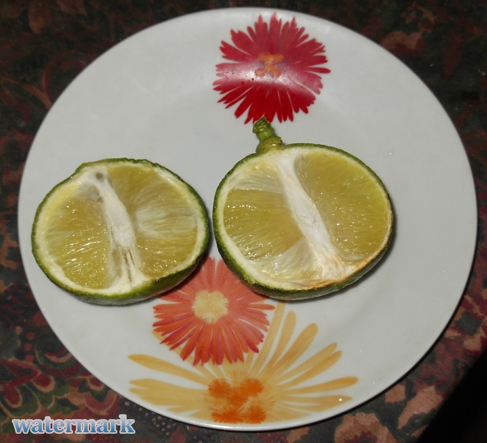 Мякоть кислая, на лимонную похожа, костей не было, шкурка очень ароматная, горьковатая. Порезал его на дольки, засыпал сахаром и сложил в банку. Зимой буду с чаем есть.