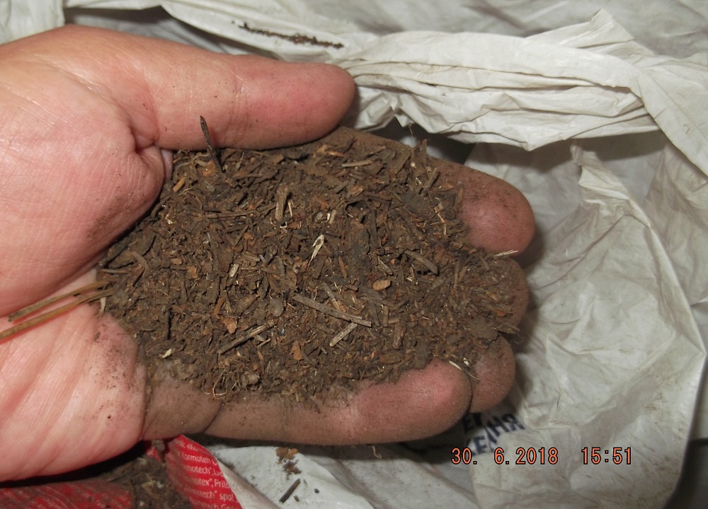 Сосновый опад, который я собираю, это слой полуразложившейся лесной подстилки, где хвоинки уже практический превратились в труху. По консистенции - что-то среднее между торфом и кокосом.