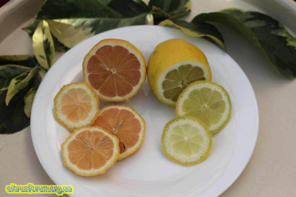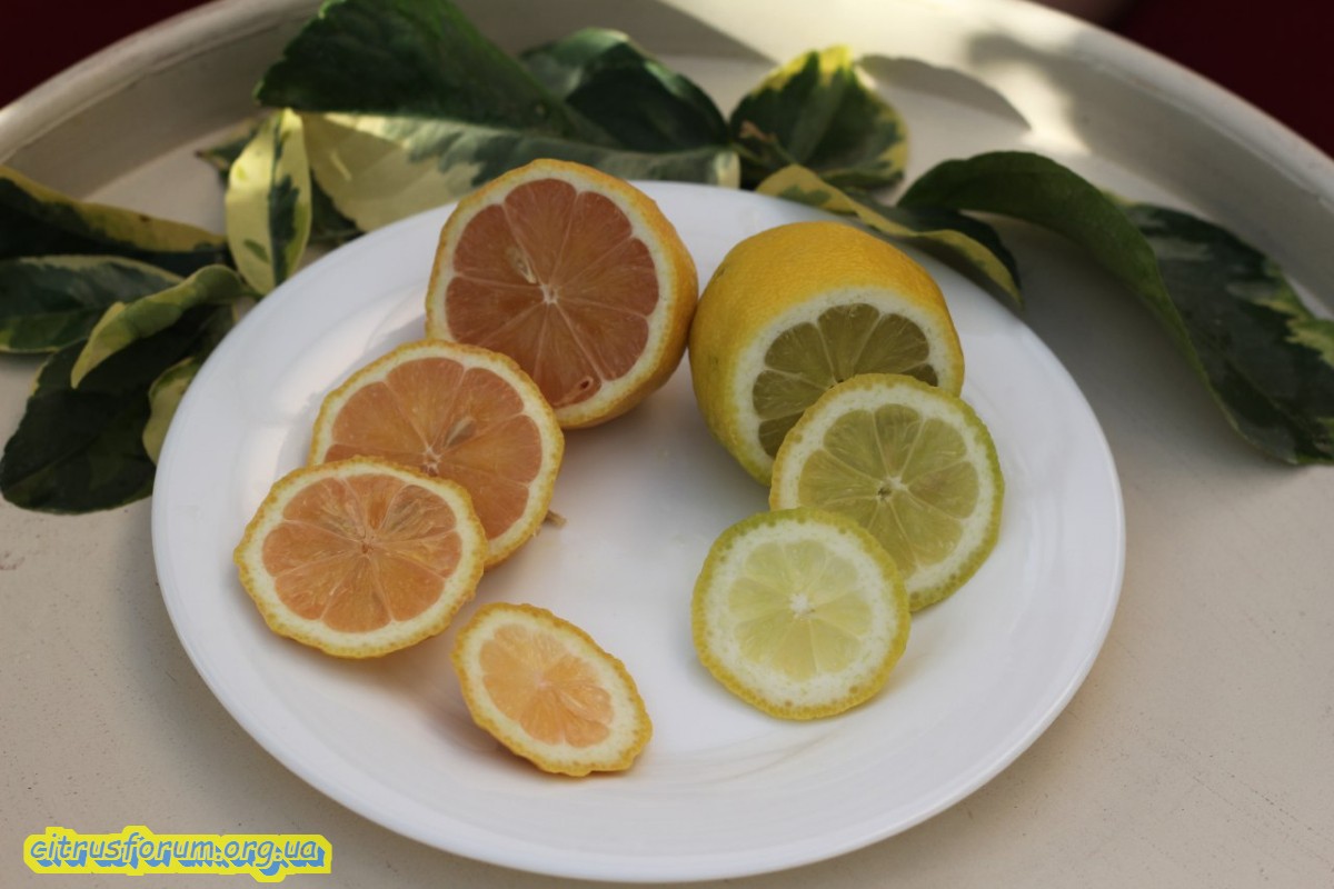 Очень декоративный лимон, с розовой мякотью, вариегатными листьями, выглядит эффектно!