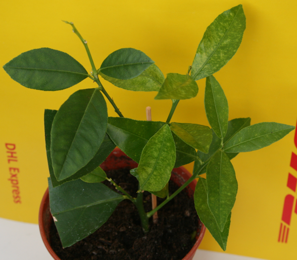 Неделю назад получил укорененный черенок лимона Rosso в нормальном состоянии. У меня начали появлятся желтые пятна на молодом приросте. Что делать?