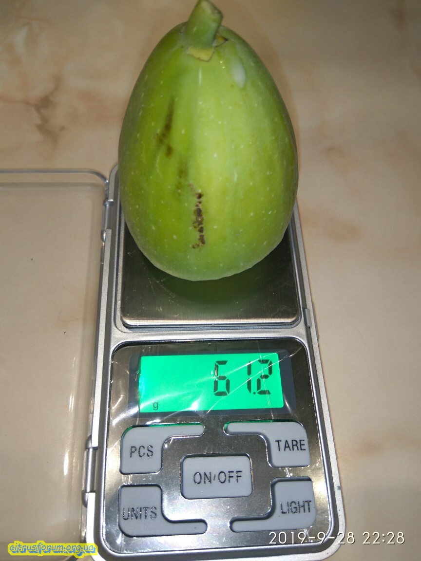 Плоды первой генерации очень крупные (8-10*6см) и тяжелые (150-180г),узкогрушевидной,сильно вытянутой формы,асимметричные,с наплывом у короткой плодоножки,Желтовато-зеленые,на вершине розоватые от просвечивающейся фиолетовой мякоти.Кожица тонкая,с продольными трещинами;мякоть малиновая,мелкозернистая,с очень мелкими семенами.Плоды второй генерации крупные (7,3*5,3 см),до 80-90 г каждый,светло-зеленые,желтоватые с очень маленьким закрытым глазком и густой белой пятнистостью.Плодоложе тонкое,белое.Мякоть почти без полости,темно-малиновая.Плоды без семян имеют розовую окраску мякоти.Свежие плоды сочные,сладкие,с приятной кислотой.Один из лучших столовых сортов.