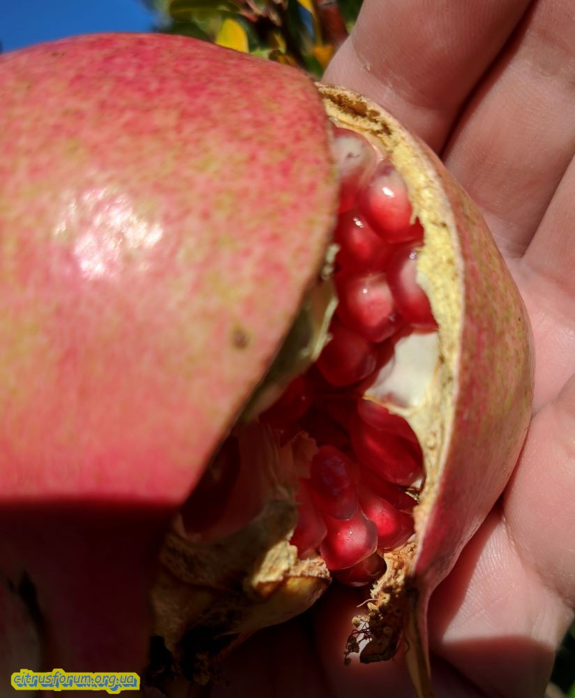 Вкус был хороший, но хотелось бы побольше сахара. Подержать подольше не получилось, гранатины начали трескаться от осенних дождей и я их снял, не дожидаясь пока они испортятся.